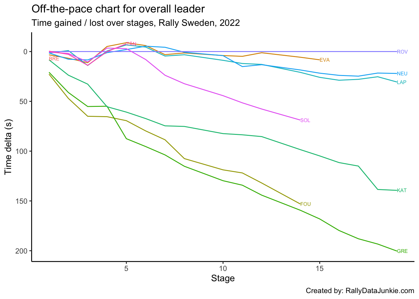 The gap to the overall leader at the end of each stage, with table ordered by overall rally position at end of last recorded stage: