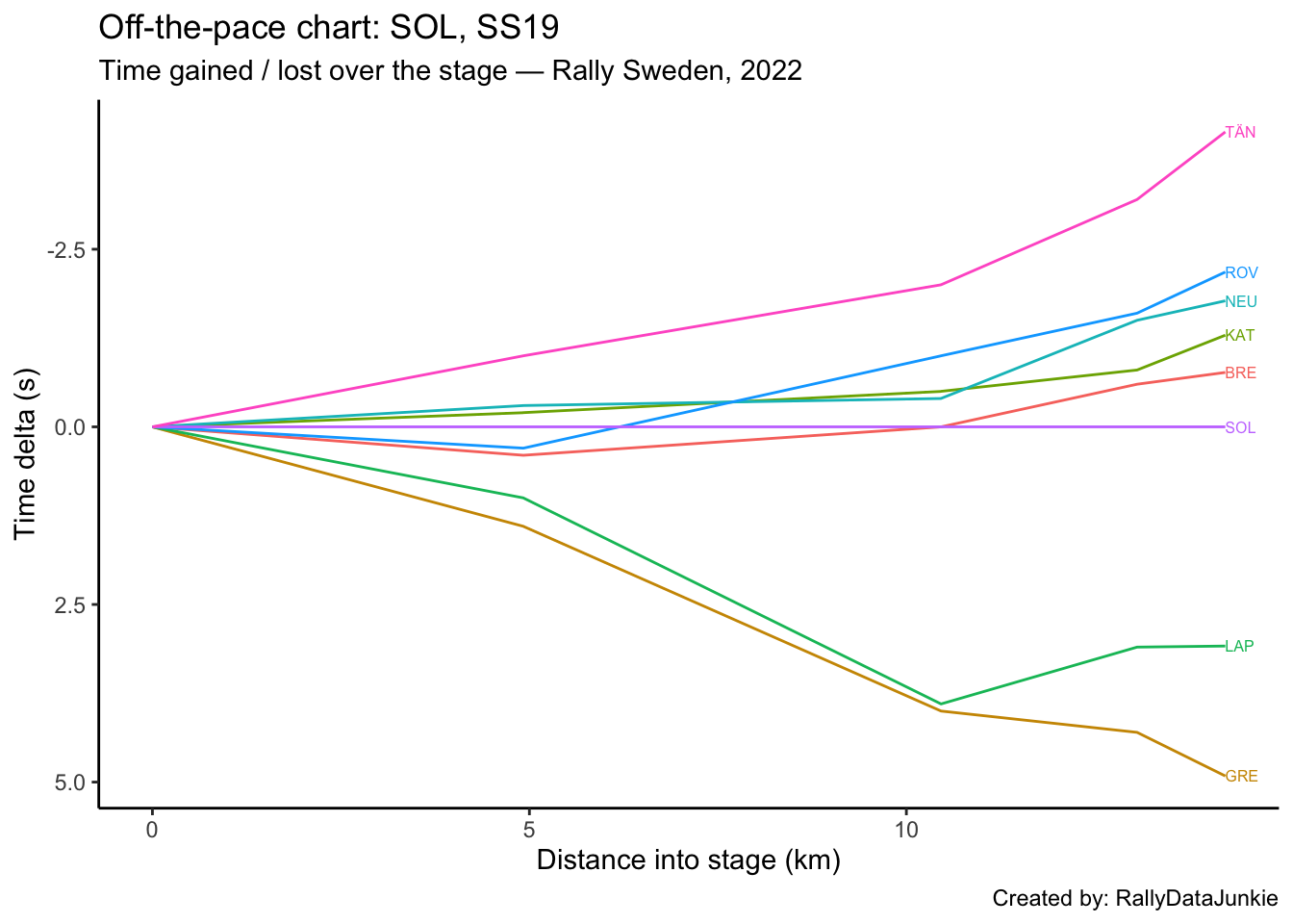 SOL’s delta in time to complete each split section compared to other drivers: