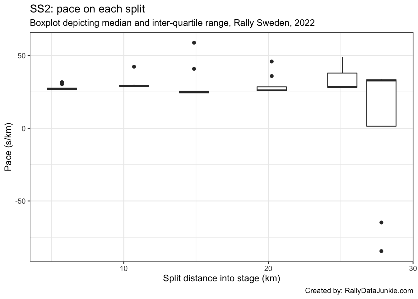 - best recorded split time at each split (ultimate actuals): gives an estimate of how well the driver’s split times compare with each first ranked split time (time into stage at each split);