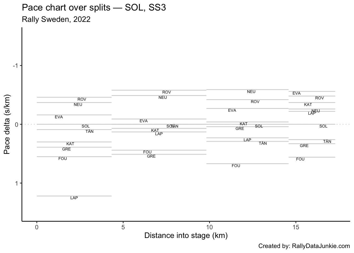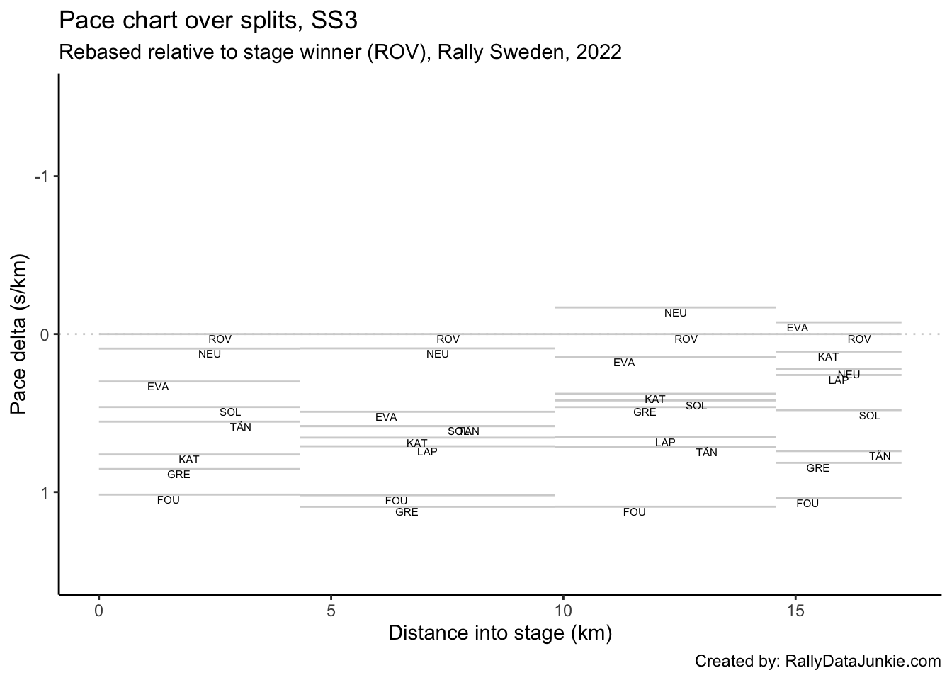 - best recorded split time at each split (ultimate actuals): gives an estimate of how well the driver’s split times compare with each first ranked split time (time into stage at each split);