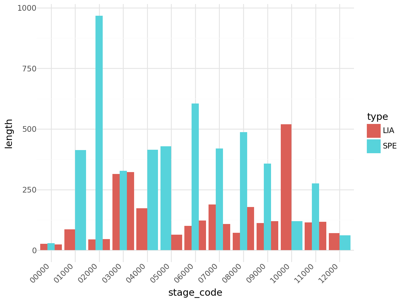 ggplot(sectors_df, aes(x='stage_code', y='length', fill='type'))